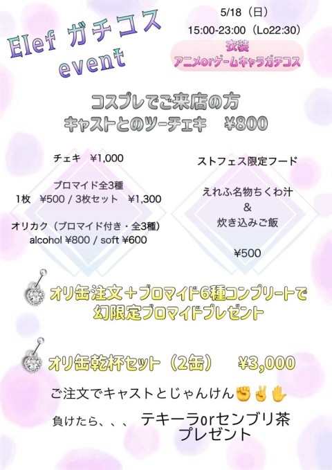 | 営業時間 | バータイム (平日) 18:00〜23:30 ナイトタイム(金・土・祝前) 23:30〜5:00 定休日毎月15日 イベント会場にて主催の場合休業する場合がございます。 | ||||||||||||||