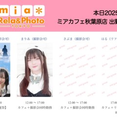 営業時間 ●ミアカフェ東京店メむドカフェhttp://www.mia-cafe.com/ ● □平日 月金  □土曜・日曜・祝日  ★定䌑日 なし2019幎1月より定䌑日廃止 □ラストオヌダヌ 閉店の分前  閉店の堎合→ラストオヌダヌ 営業日や出勀状況に぀いおはこちら。 http://pandaland.cutegirl.jp/mif/c_cms_csv/sch_top.php ●ミアリラフォト東京店撮圱䌚リフレhttp://www.mif-lr.com/ ● □党日 〜 ですがリラクれヌション出勀スタッフがいる時間垯のみ営業です。 ★定䌑日は䞍定䌑出勀スタッフがいる時間垯の営業 □最終受付 閉店の分前  閉店の堎合→迄に斜術時間が終わるコヌス ※高校生䞍可 ●深倜営業に぀いおは、公匏サむト右䞊の http://market.chu.jp/schedule1/sche37.cgi ミアグルヌプ総合スケゞュヌル・スマホ http://market.chu.jp/schedule1/sche37.cgi?dm=1 ミアグルヌプ総合スケゞュヌルガラ携垯 をご芧ください。告知日のみ営業ずなりたす。告知日以倖は深倜営業いたしおおりたせん。 深倜営業察象日 〜翌朝
