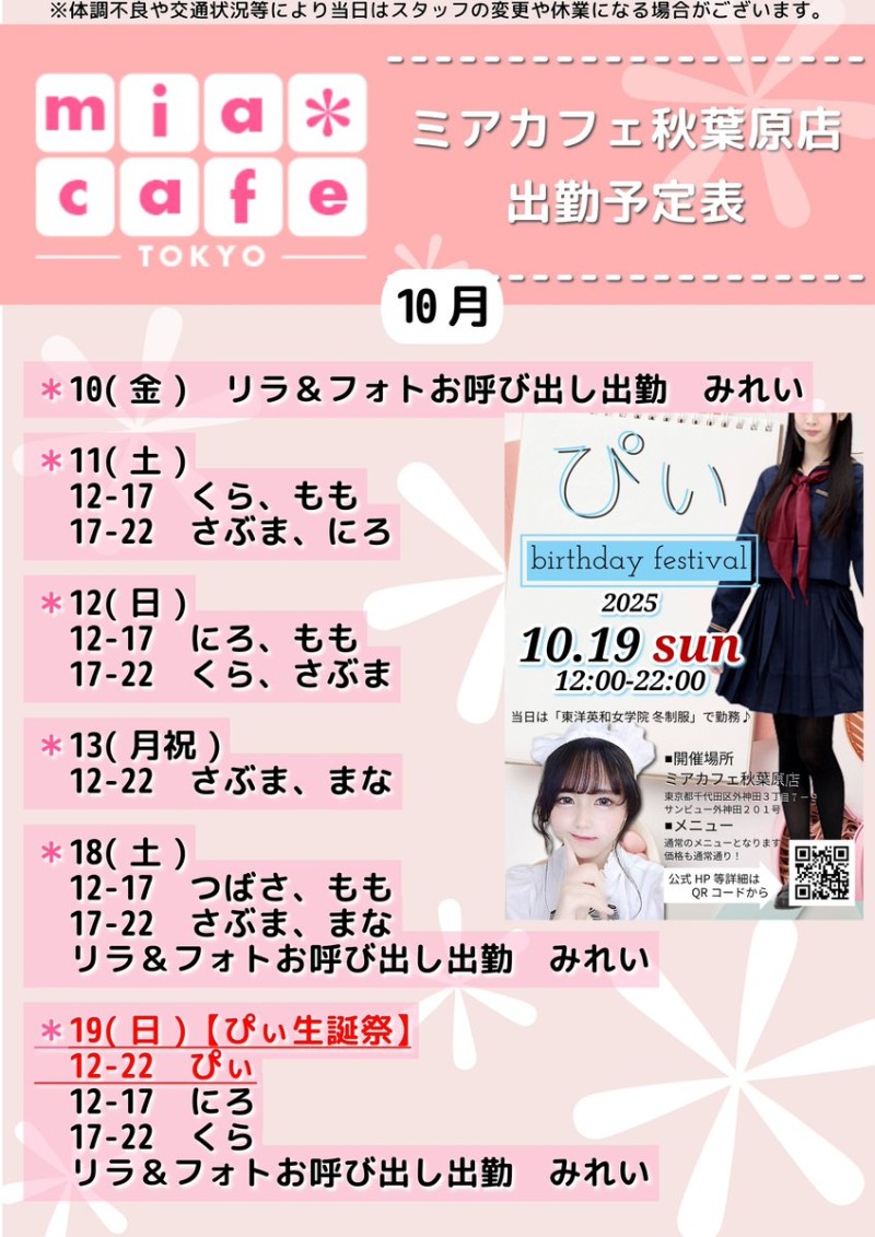 | å¶æ¥æé | âãã¢ã«ãã§æ±äº¬åºïŒã¡ã€ãã«ãã§ïŒhttp://www.mia-cafe.com/ãâ â¡å¹³æ¥ãæïœéãïŒïŒïŒïŒïŒïœïŒïŒïŒïŒïŒ â¡åæã»æ¥æã»ç¥æ¥ãïŒïŒïŒïŒïŒïœïŒïŒïŒïŒïŒ â å®äŒæ¥ããªãïŒ2019幎1æããå®äŒæ¥å»æ¢ïŒ â¡ã©ã¹ããªãŒããŒãéåºã®ïŒïŒåå ãïŒïŒïŒïŒïŒéåºã®å ŽåâïŒïŒïŒïŒïŒã©ã¹ããªãŒããŒ å¶æ¥æ¥ãåºå€ç¶æ³ã«ã€ããŠã¯ãã¡ãã http://pandaland.cutegirl.jp/mif/c_cms_csv/sch_top.php âãã¢ãªã©ïŒãã©ãæ±äº¬åºïŒæ®åœ±äŒïŒãªãã¬ïŒhttp://www.mif-lr.com/ãâ â¡å šæ¥ãïŒïŒïŒïŒïŒãïŒïŒïŒïŒïŒãã§ãããªã©ã¯ãŒãŒã·ã§ã³åºå€ã¹ã¿ãããããæé垯ã®ã¿å¶æ¥ã§ãã â å®äŒæ¥ã¯äžå®äŒïŒåºå€ã¹ã¿ãããããæé垯ã®å¶æ¥ïŒ â¡æçµåä»ãéåºã®ïŒïŒåå ãïŒïŒïŒïŒïŒéåºã®å ŽåâïŒïŒïŒïŒïŒïŒïŒïŒïŒïŒïŒè¿ã«æœè¡æéãçµããã³ãŒã¹ïŒ â»é«æ ¡çäžå¯ âæ·±å€å¶æ¥ã«ã€ããŠã¯ãå ¬åŒãµã€ãå³äžã® http://market.chu.jp/schedule1/sche37.cgi ãã¢ã°ã«ãŒãç·åã¹ã±ãžã¥ãŒã«ïŒïŒ°ïŒ£ã»ã¹ããïŒ http://market.chu.jp/schedule1/sche37.cgi?dm=1 ãã¢ã°ã«ãŒãç·åã¹ã±ãžã¥ãŒã«ïŒã¬ã©æºåž¯ïŒ ãã芧ãã ãããåç¥æ¥ã®ã¿å¶æ¥ãšãªããŸããåç¥æ¥ä»¥å€ã¯æ·±å€å¶æ¥ããããŠãããŸããã æ·±å€å¶æ¥å¯Ÿè±¡æ¥ãïŒïŒïŒïŒïŒãç¿æïŒïŒïŒïŒïŒïŒ¬ïŒïŒ¯ïŒïŒïŒïŒïŒïŒ | ||||||||||||||
