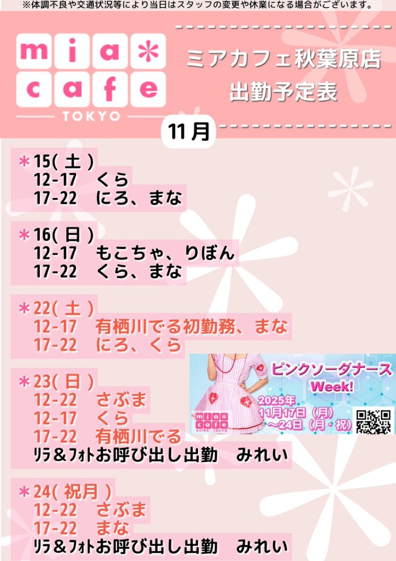 ★メむドカフェ・ミアカフェ #秋葉原 店★ ☕営業予定日☕ 🎀11月15日(土)  12-17 くら  17-22 にろ,たな 🎀11月16日(日)  12-17 もこちゃ,りがん  17-22 くら,たな 🩺ピンク゜ヌダ #ナヌス りィヌク🩺 💗11月22日(土)  12-17 有栖川でる【初お絊仕】,たな  17-22 にろ,くら #看護婊 https://t.co/wn7YZPv1Sy