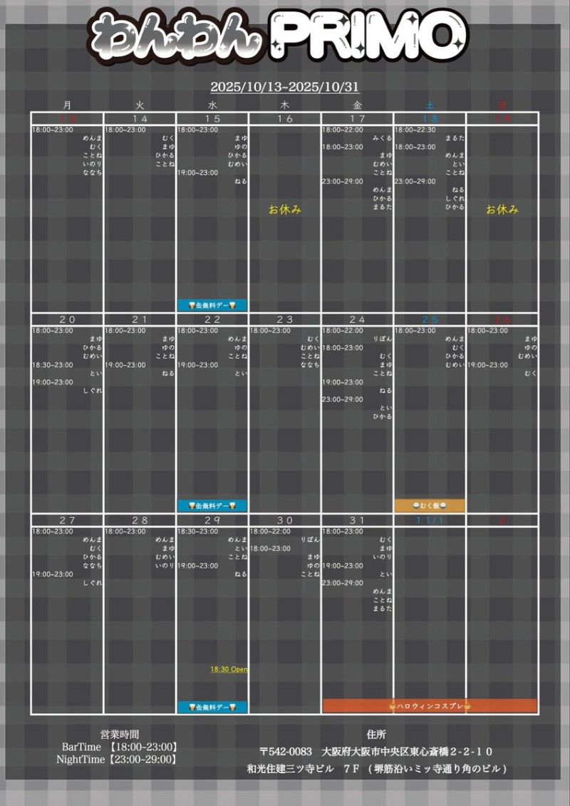 営業時間 | 月~日 18~23 金、土 23~29(不定期) | ||||||||||||||