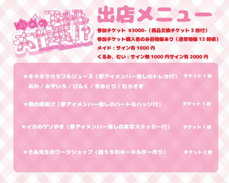 ゆめのアイドル大作戦の10:00から窓枠前で行われる出店メニューです!