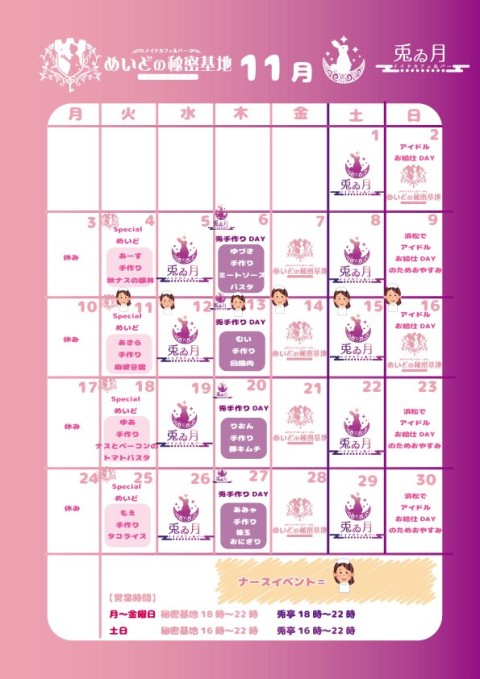 【🎀11月カレンダー🎀】 アイドルDAY開催🎤 ナースイベント開催💉 ナースイベメニューご予約はDMから、当日注文の特典は後日渡しです。 手作りご飯のご予約ページはこちらから💁‍♀️ https://t.co/NzmXmU3K5P #豊橋 #メイド #浜松 #コンカフェ #名古屋 https://t.co/AKTCAX2AHZ