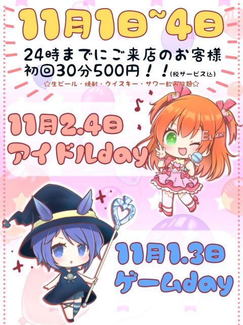 【♠イベントのお知らせ♠】 11月1日~11月4日 24時までにご来店のお客様 初回30分500円!! 1・3日はゲームday✨️ 2・4日はアイドルday✨️ ゲームキャラ、アイドルキャラのみんなと楽しみましょー - ̗̀( ᐛ )⊃🍻⊂( ᐖ ) ̖́- https://t.co/FIUQW92cF0